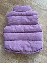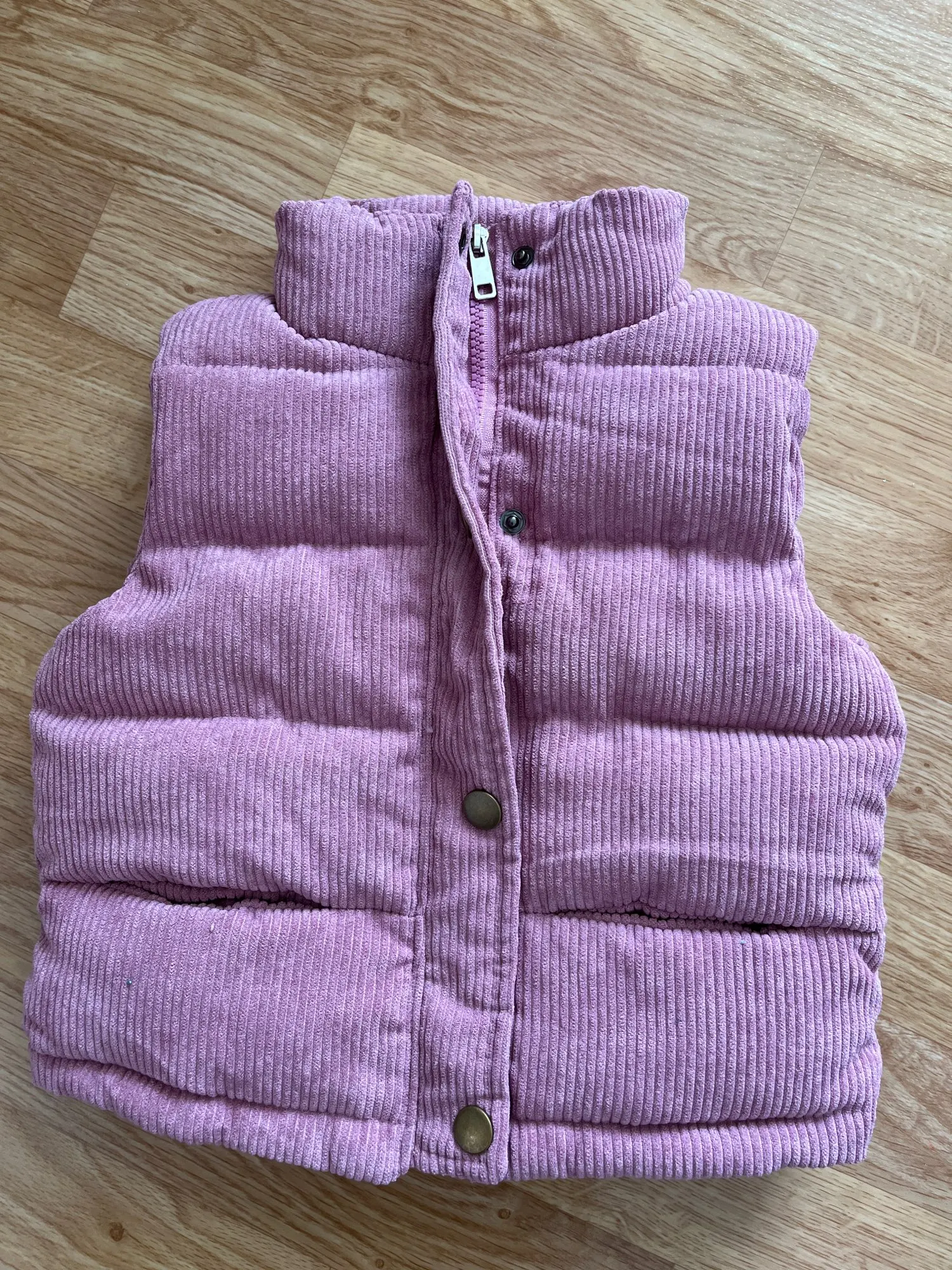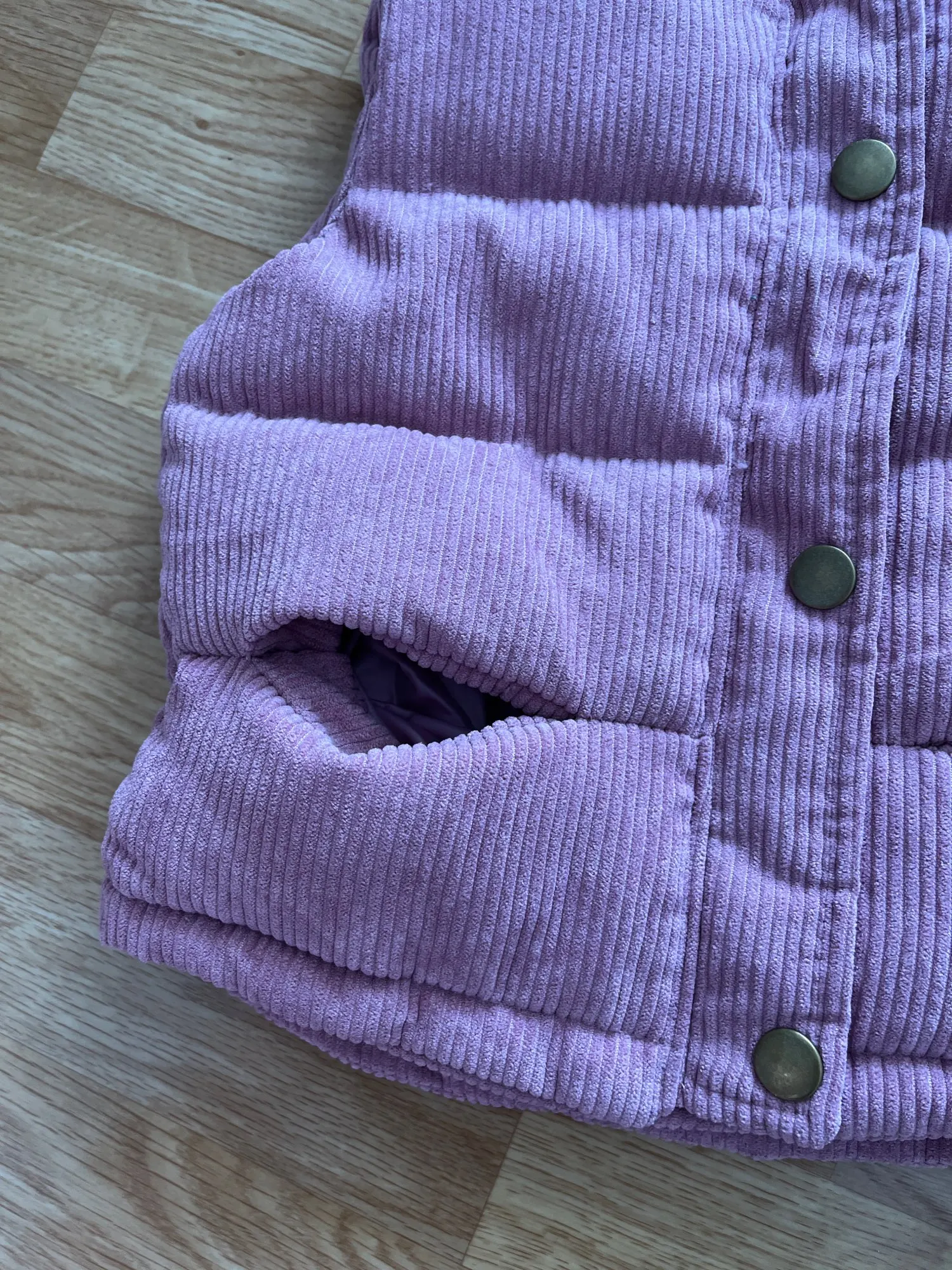 Very pretty sleeveless puffer jacket. The fabric is really pleasant. It is quite thick. It has two small pockets on the sides and a zipper.