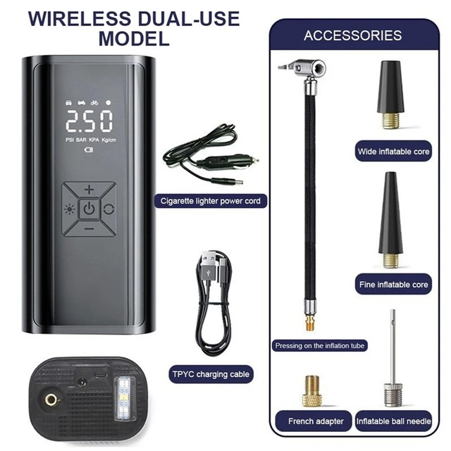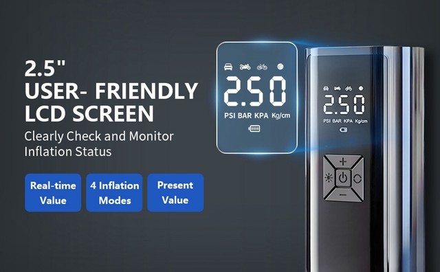 4. Full screen digital display: The display screen of the inflation pump can display information such as pressure and power, making it convenient for users to understand the working status of the inflation pump.