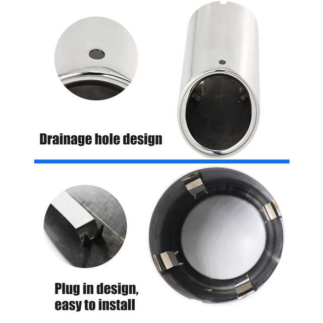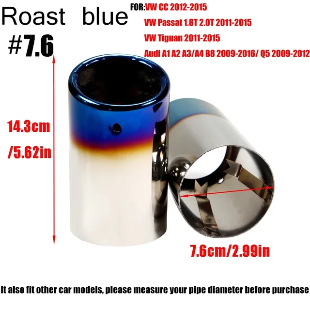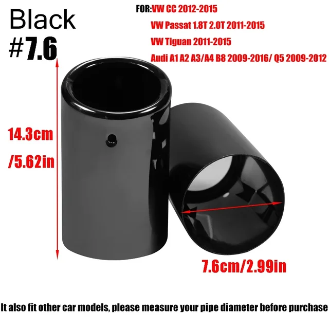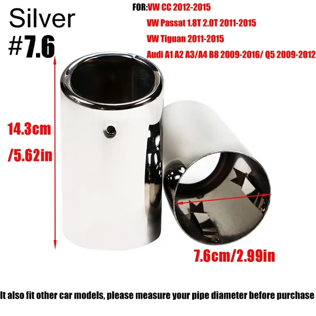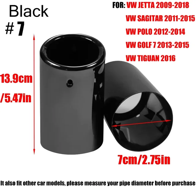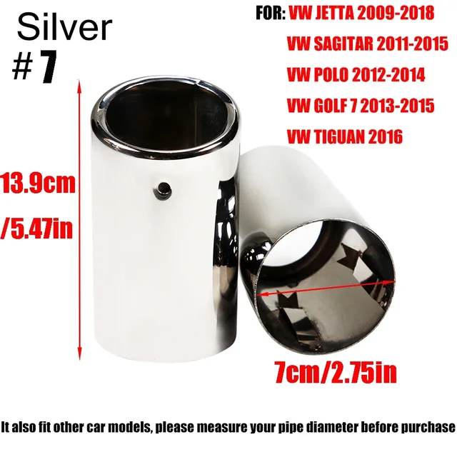 Inlet Diameter: 7.0CM/2.75IN Applicable: VW JETTA 2009-2018 VW SAGITAR 2011-2015 VW POLO 2012-2014 VW GOLF 7 2013-2015 VW TIGUAN 2016 1.Production Process: High quality 304 stainless steel, Durable and not corrodible ,Plating process,Surface polishing makes tail throat looks shiny bright 2.Protect the Original Tailpipe: Protect the original exhaust pipe from sun and rain, avoid rusting and deformation 3.Easy to Install: There is no need to replace any parts,No weld needed. No drill needed.Super Easy to Install