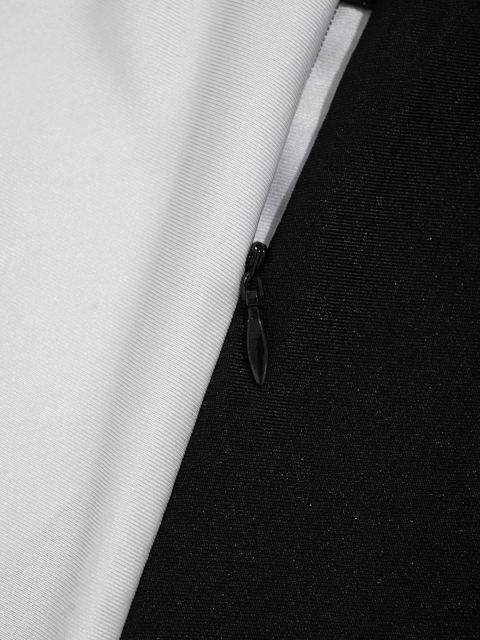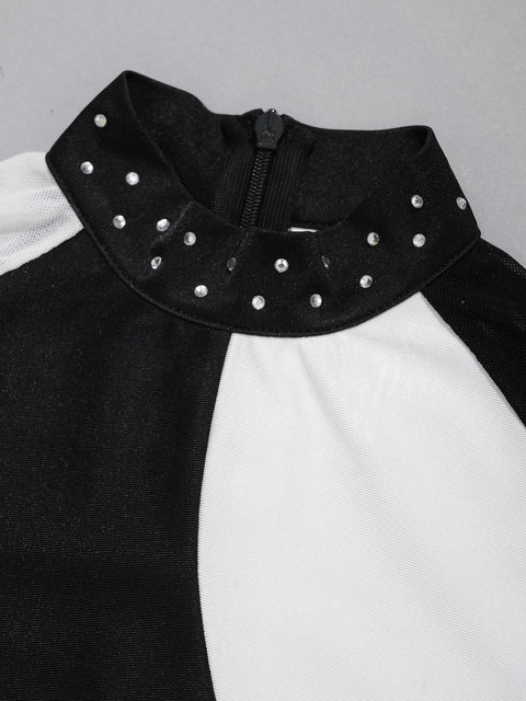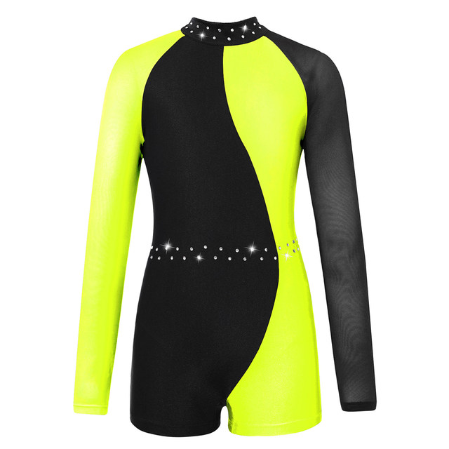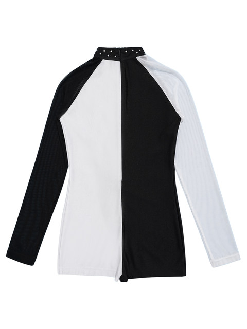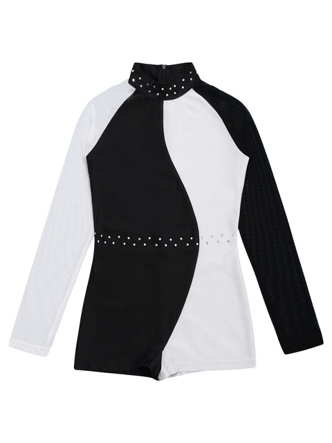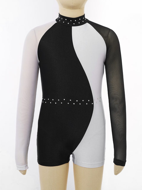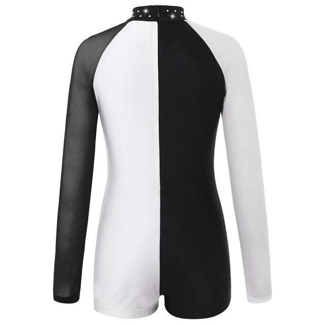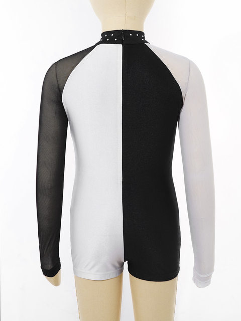 레오타드는 스판덱스 메시 긴 소매와 라운드 칼라, 대비 색상, 패치 워크 스타일 디자인을 갖추고 있습니다.
