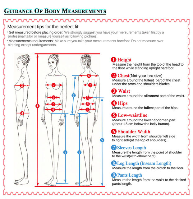 아래와 같이 올바른 표준 크기 또는 측정을 이메일로 알려주십시오.섹스, 키, 체중, 가슴, 허리, 엉덩이, 낮은 허리 라인, 어깨 너비, 소매 길이, 다리 길이, 바지 길이.