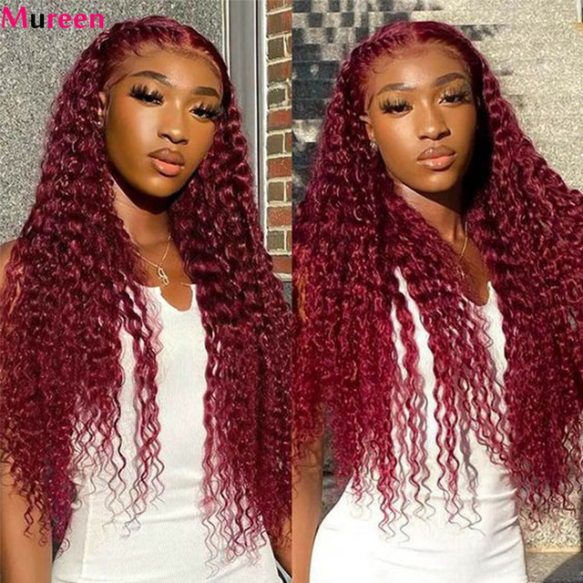 Mureen 99j 컬러 딥 웨이브 레이스 정면 가발 인모 버건디 13X4 여성용 전체 레이스 프론트 가발 미리 뽑은 인모 가발