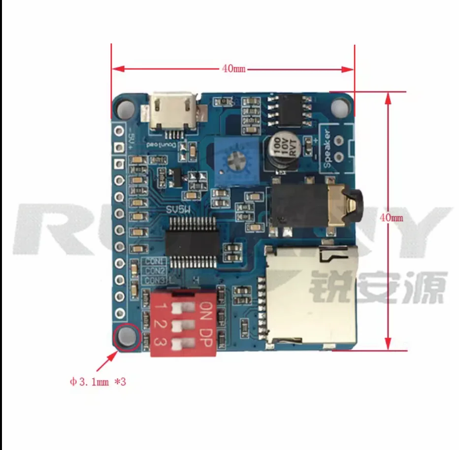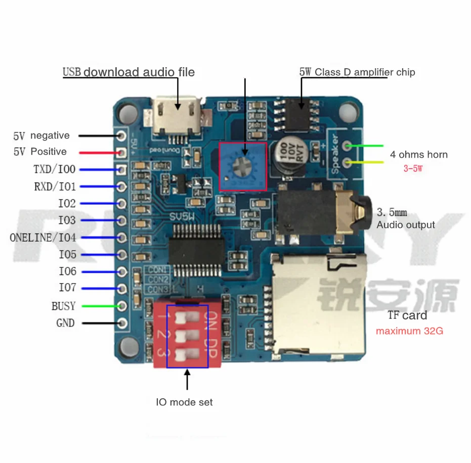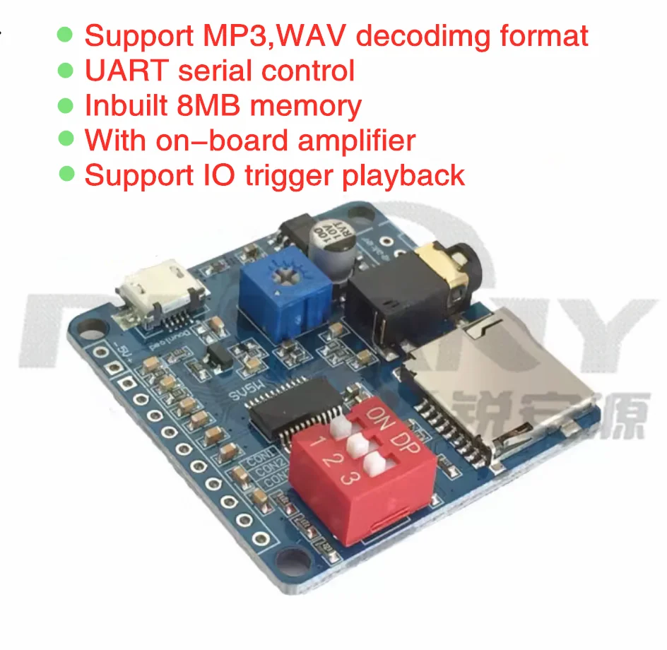 DY-SV5W ºÎ¹®¿¡¼ µ¶¸³ÀûÀ¸·Î °³¹ß ÇÑ Áö´ÉÇü À½¼º ¸ðµâÀÔ´Ï´Ù. I/O ¼¼±×¸ÕÆ® Æ®¸®°Å, UART Á÷·Ä Á¦¾î, ONE_line ´ÜÀÏ ¹ö½º Á÷·Ä Á¦¾î¸¦ ÅëÇÕÇÕ´Ï´Ù. ¿Âº¸µå 5WD Ŭ·¡½º ¾ÚÇÁ ȸ·Î, 4 ohms 3 ~ 5W ¶ó¿ìµå ½ºÇÇÄ¿¸¦ Á÷Á¢ ±¸µ¿ ÇÒ ¼ö ÀÖ½À´Ï´Ù. MP3, WAV µðÄÚµù Çü½ÄÀ» Áö¿øÇÕ´Ï´Ù. ÃÖ´ë Áö¿ø 32Gbit (4MByte) TF Ä«µå ¸Þ¸ð¸®, USB ÄÉÀÌºí ¾÷µ¥ÀÌÆ® TF Ä«µå¸¦ ÅëÇØ ÄÄÇ»ÅÍ¿¡ ¿¬°áÇÏ¿© ¿Àµð¿À ÆÄÀÏ ÀúÀå 3.5mm ¿Àµð¿À ÀÎÅÍÆäÀ̽º, U µð½ºÅ© ÀÎÅÍÆäÀ̽º, ¸¶ÀÌÅ©·Î USB ´Ù¿î·Îµå ÀÎÅÍÆäÀ̽º, ´ÜÀÏ ¸ðµâÀÇ ¹öư ¸ðµâ